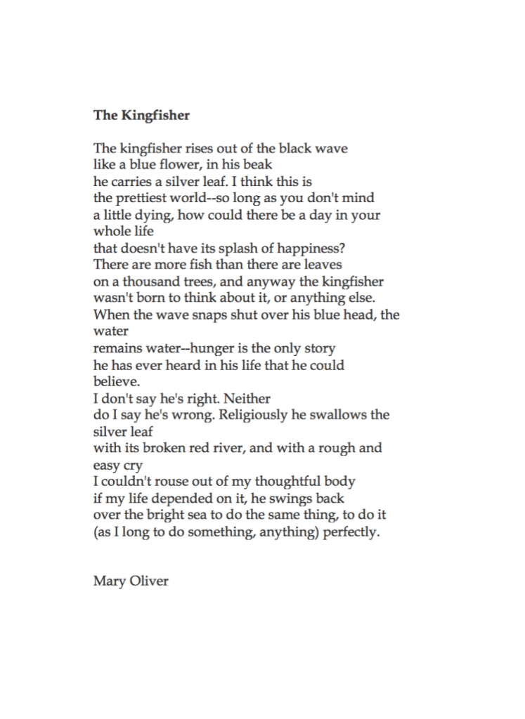 Mary Oliver here reminds us of the beauty that is inherent in everything on this earth, including death. As Mary would remind us, what is death but not the perpetuation of the glorious cycle of life? In the most explicit way, the death of a prey animal will directly nourish and feed its predator. Similarly, the shedding of leaves in the winter will allow the tree to later blossom in the spring.