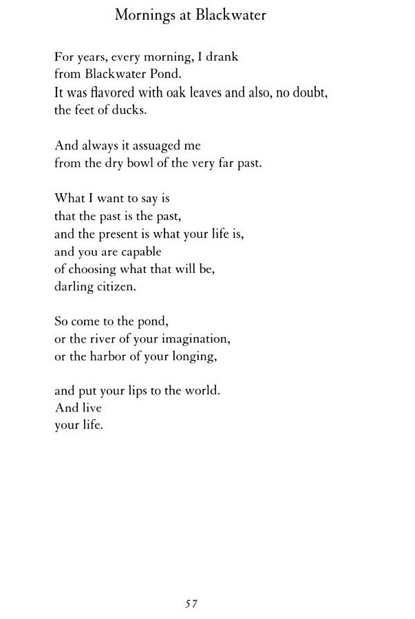 I think this Mary Oliver poem is one of my favorites yet. It ties two of the most important things in my life together. It reminds me of something Marcus Aurelius states in his book meditations: the present moment is the only thing that we have, therefore it is the only thing that can be taken away from us. When we start worrying about the past or the potential what-ifs of the future, we steal the present from ourselves and we no longer have control over the one thing we have the power to control. Being present is something that, in this day and age, takes effort to achieve. But in my opinion, it is the healthiest state one can be in. In the way Ms. Oliver puts it, you put your lips to the pond of life and truly live life.