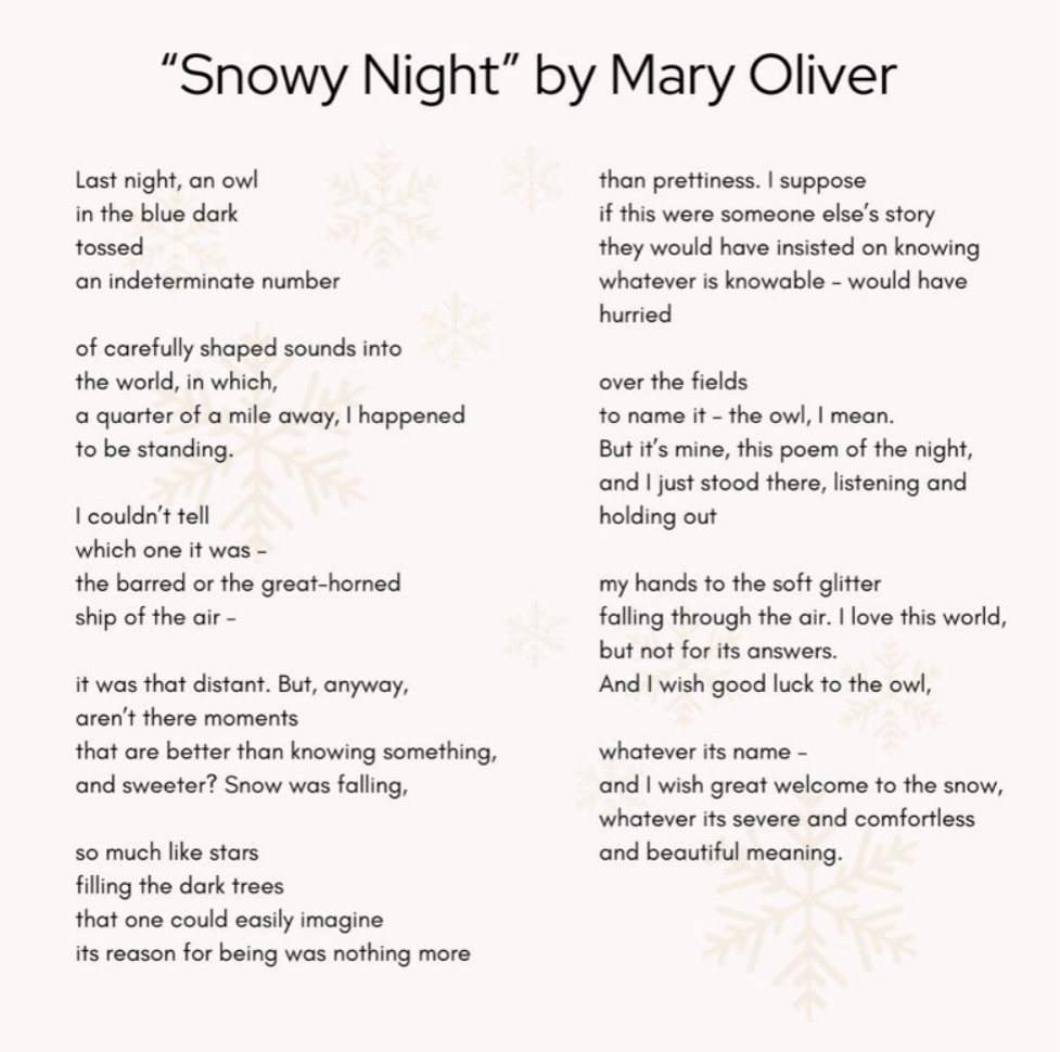 Hello and happy snow day! We just got our first bit of snow today, and I think it’s because you guys posted so thank you. Snowy owls are so cool, and I learned so much from reading this. I didn’t know their migration patterns were so inconsistent and definitely didn’t know they sometimes make it all the way to Hawaii. Hearing the hoot of an owl brings me back to the nostalgic summer afternoons where the sun starts to wane at my grandma’s house and all of the cousins are out in the yard sweaty after a game of kickball. It reminds me of the childlike wonder that Mary Oliver conveys in so many of her poems, and it reminds me of the sometimes invisible beauty that we are constantly surrounded by. I have only ever seen an owl once in the wild – it was in the middle of Patagonia, and I almost missed it: a pygmy owl, perched in the middle of a tree, hooting at us for stepping on its home turf. It honestly amazed me how such a small creature could be so territorial and violent to its prey. Owls have always held kind of a majestic aura to me, and seeing it felt like a good omen, and definitely something I will never forget. I hope everyone can share a special moment like that with any sort of wildlife, especially an owl. Happy Mary Oliver Monday (even though it’s a tuesday now)!